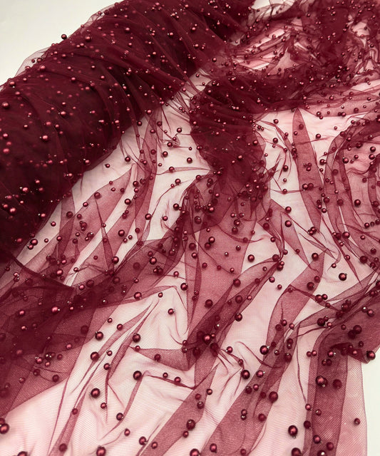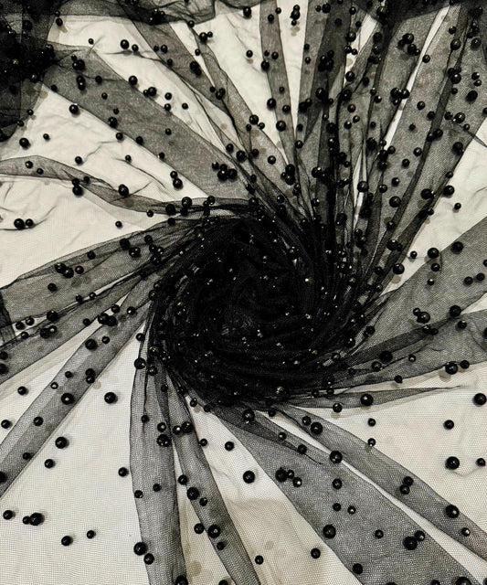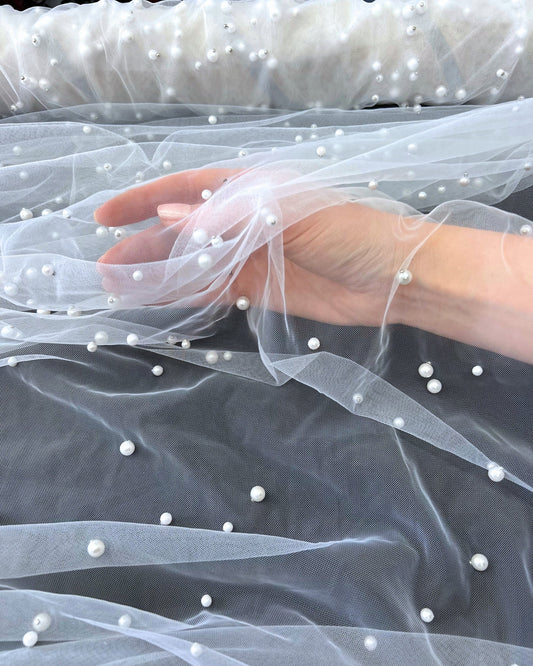 White Pearl Tulle Fabric, Scattered Pearls Studded Mesh, White Tulle Fabric with Pearls, 2-Way Stretch Pearl Beaded Tulle for Veils