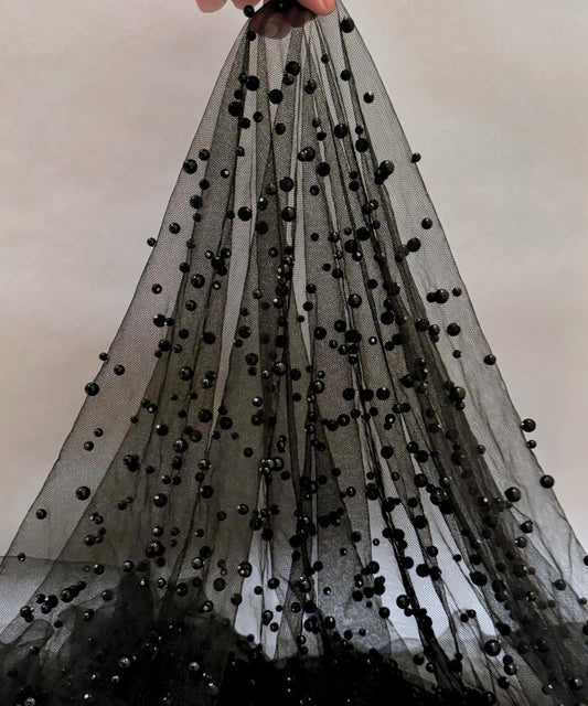 Black Scattered Pearls Studded Mesh, Black Pearl Tulle Fabric, Black Tulle Lace Fabric with Pearls, Stretch Black Beaded Tulle Pearl Lace