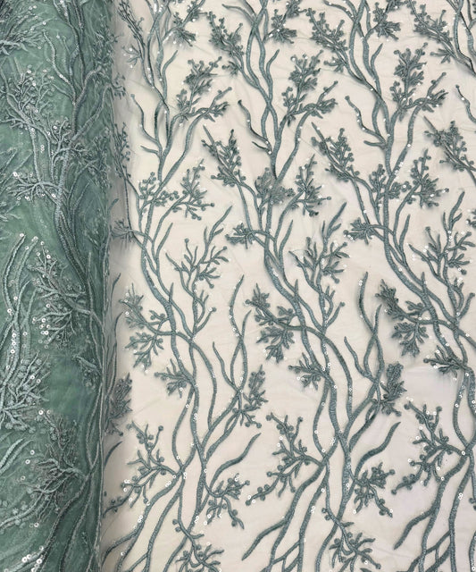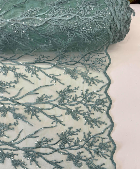 Sage Green Lace Fabric, Sage Embroidered Lace Fabric Floral Embroidery with Sequins on Mesh Lace Fabric by the Yard, Sage Embroidered Fabric