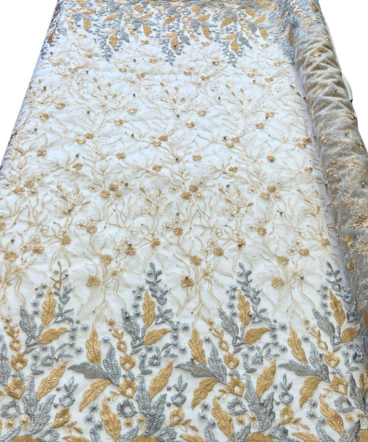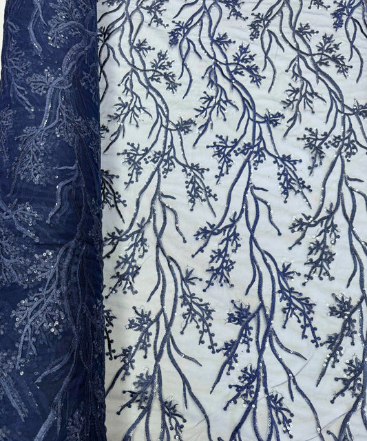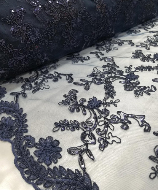 Navy Blue/Gold Embroidered Lace Fabric, Floral Embroidery on Lace Navy Blue Embroidered Lace Fabric Blue/Gold Lace by the Yard, African Lace